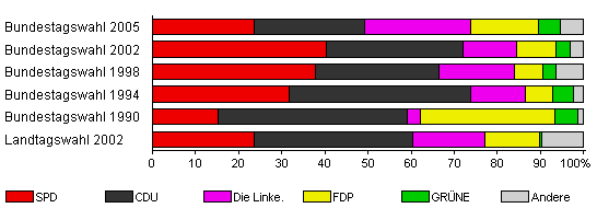 | Bundestagswahl 2005 | 72,3 | 23,6 | 25,6 | 24,6 | 15,8 | 4,9 | 5,4 | |