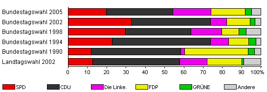 | Landtagswahl 2002 | 53,4 | 12,6 | 45,3 | 14,0 | 18,2 | 1,0 | 8,8 | |