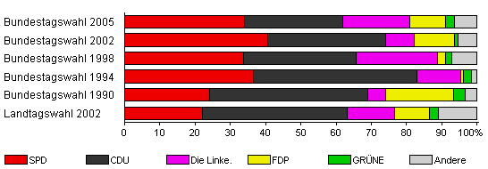 | Bundestagswahl 2005 | 63,2 | 34,0 | 28,0 | 19,0 | 10,0 | 2,5 | 6,5 | |