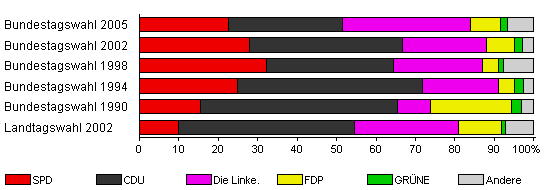 | Bundestagswahl 2005 | 65,9 | 22,6 | 28,9 | 32,5 | 7,5 | 1,8 | 6,8 | |