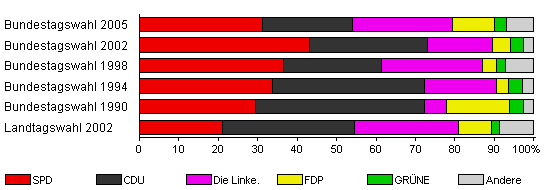 | Landtagswahl 2002 | 53,6 | 21,1 | 33,3 | 26,6 | 8,3 | 2,1 | 8,6 | |