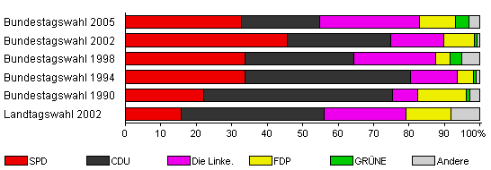 | Bundestagswahl 2005 | 67,3 | 32,7 | 22,0 | 28,2 | 10,1 | 3,9 | 3,1 | |