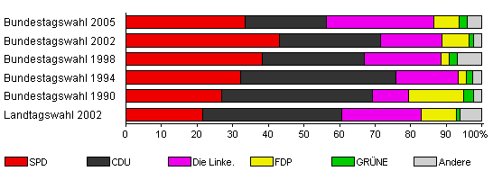 | Landtagswahl 2002 | 57,1 | 21,6 | 39,0 | 22,3 | 10,0 | 0,9 | 6,2 | |