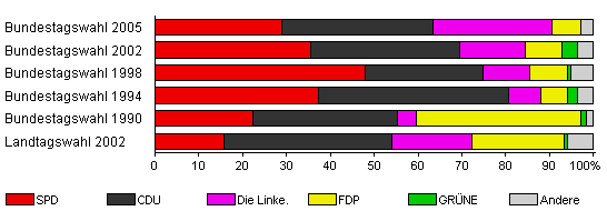 | Landtagswahl 2002 | 66,1 | 15,8 | 38,3 | 18,3 | 20,8 | 0,8 | 5,8 | |