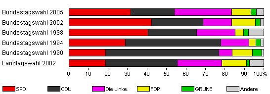 | Bundestagswahl 2005 | 75,0 | 31,6 | 22,4 | 29,5 | 9,7 | 3,0 | 3,8 | |