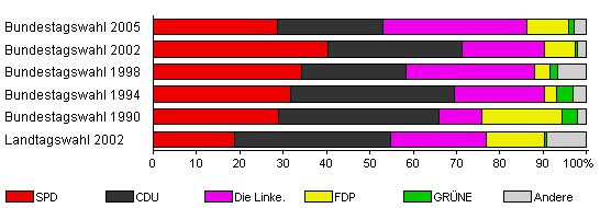 | Bundestagswahl 2005 | 69,5 | 28,7 | 24,3 | 33,3 | 9,6 | 1,2 | 2,9 | |