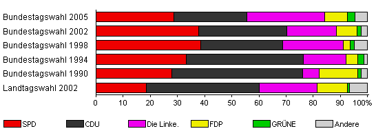 | Bundestagswahl 2005 | 68,1 | 28,6 | 27,0 | 28,5 | 8,4 | 2,8 | 4,7 | |