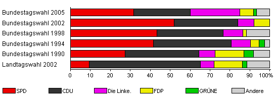 | Landtagswahl 2002 | 67,1 | 9,3 | 55,8 | 7,0 | 14,0 | 2,3 | 11,6 | |
