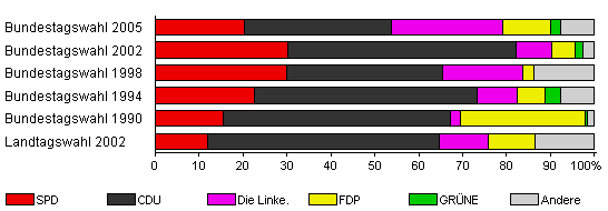 | Bundestagswahl 2005 | 67,7 | 20,2 | 33,5 | 25,4 | 11,0 | 2,3 | 7,5 | |