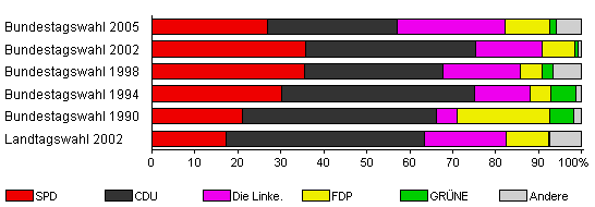| Landtagswahl 2002 | 68,9 | 17,3 | 46,2 | 18,8 | 9,9 | 0,4 | 7,4 | |