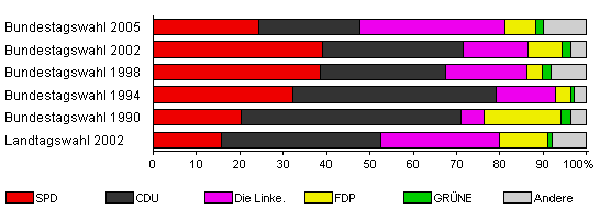 | Landtagswahl 2002 | 47,3 | 15,8 | 36,6 | 27,5 | 11,1 | 1,0 | 8,1 | |