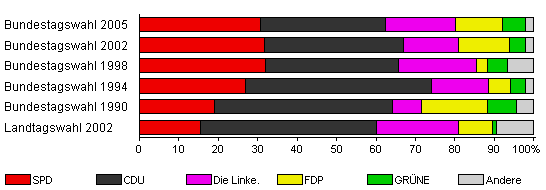 | Bundestagswahl 2002 | 65,1 | 31,8 | 35,1 | 14,0 | 13,0 | 4,0 | 2,0 | |
