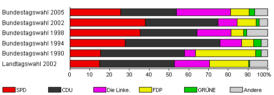 | Bundestagswahl 2005 | 67,7 | 25,5 | 28,2 | 27,5 | 9,4 | 2,8 | 6,6 | |