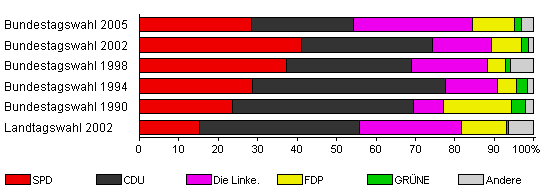 | Landtagswahl 2002 | 56,3 | 15,2 | 40,5 | 26,0 | 11,3 | 0,6 | 6,5 | |