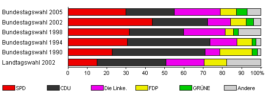 | Bundestagswahl 2005 | 63,3 | 30,0 | 25,1 | 23,7 | 8,4 | 5,6 | 7,3 | |