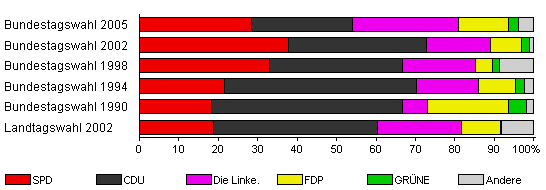 | Landtagswahl 2002 | 55,9 | 18,8 | 41,6 | 21,2 | 9,9 | 0,3 | 8,0 | |