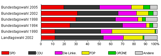 | Bundestagswahl 2005 | 76,8 | 19,5 | 30,7 | 27,3 | 10,4 | 5,6 | 6,5 | |