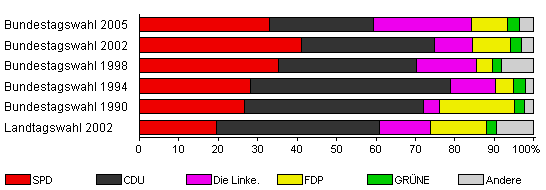 | Bundestagswahl 2005 | 65,6 | 32,9 | 26,5 | 24,9 | 8,9 | 3,1 | 3,8 | |