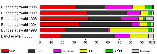 | Bundestagswahl 2005 | 67,1 | 32,0 | 25,4 | 23,9 | 11,7 | 6,1 | 1,0 | |