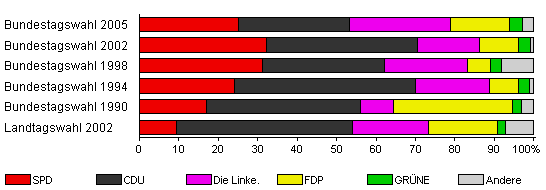 | Bundestagswahl 2005 | 67,2 | 25,2 | 28,1 | 25,6 | 15,0 | 3,2 | 2,9 | |