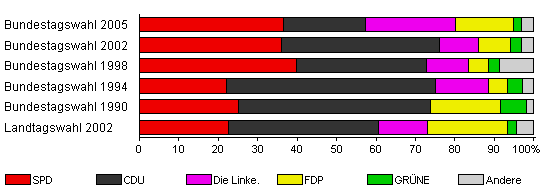 | Bundestagswahl 2005 | 78,2 | 36,5 | 20,8 | 22,9 | 14,6 | 2,1 | 3,1 | |