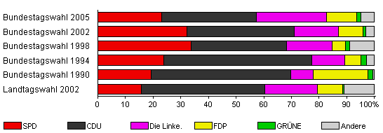 | Bundestagswahl 2005 | 74,5 | 23,1 | 34,1 | 25,4 | 11,0 | 1,5 | 4,9 | |