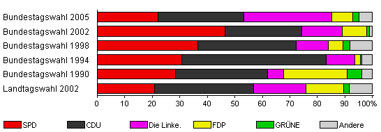 | Bundestagswahl 2005 | 69,7 | 22,0 | 31,3 | 31,9 | 7,7 | 2,2 | 4,9 | |
