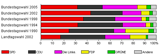 | Bundestagswahl 2005 | 58,3 | 31,7 | 21,6 | 30,1 | 8,1 | 3,5 | 5,0 | |