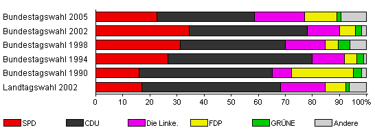 | Landtagswahl 2002 | 58,7 | 17,1 | 51,2 | 16,3 | 7,8 | 1,2 | 6,6 | |