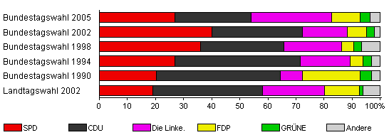 | Landtagswahl 2002 | 51,5 | 18,9 | 39,3 | 21,9 | 12,5 | 1,2 | 6,3 | |