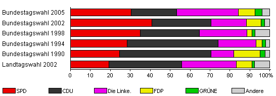 | Bundestagswahl 2005 | 70,0 | 30,4 | 22,8 | 31,1 | 8,3 | 3,4 | 3,9 | |