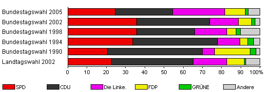 | Landtagswahl 2002 | 48,6 | 22,6 | 42,6 | 17,4 | 9,3 | 0,6 | 7,5 | |