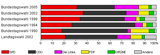 | Bundestagswahl 2005 | 73,2 | 31,3 | 32,4 | 21,0 | 8,7 | 2,2 | 4,4 | |