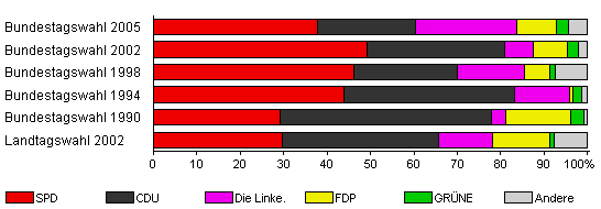 | Bundestagswahl 2005 | 74,6 | 37,7 | 22,7 | 23,4 | 9,1 | 2,6 | 4,5 | |