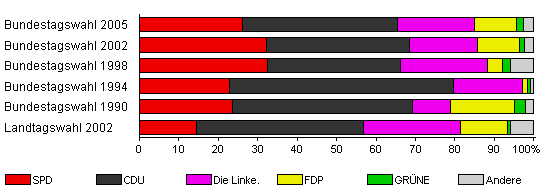 | Landtagswahl 2002 | 55,5 | 14,5 | 42,2 | 24,6 | 12,0 | 0,9 | 5,8 | |