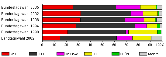| Bundestagswahl 2005 | 78,1 | 25,5 | 35,8 | 20,3 | 13,3 | 0,8 | 4,3 | |