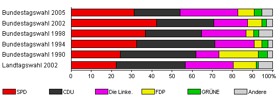 | Bundestagswahl 2005 | 58,2 | 31,1 | 22,9 | 28,8 | 8,0 | 3,7 | 5,5 | |