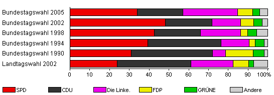 | Bundestagswahl 2005 | 64,9 | 34,1 | 23,0 | 27,7 | 7,6 | 3,5 | 4,1 | |