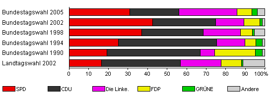 | Bundestagswahl 2005 | 63,5 | 30,9 | 25,2 | 29,5 | 7,7 | 2,9 | 3,7 | |