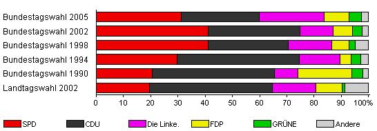 | Landtagswahl 2002 | 57,2 | 19,5 | 45,1 | 16,1 | 9,6 | 1,0 | 8,8 | |