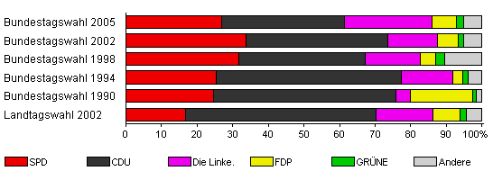 | Landtagswahl 2002 | 59,7 | 16,8 | 53,4 | 16,1 | 7,5 | 1,9 | 4,3 | |