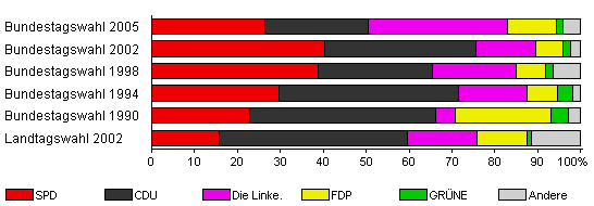 | Landtagswahl 2002 | 63,8 | 15,7 | 43,9 | 16,3 | 11,7 | 0,8 | 11,7 | |