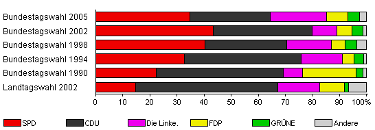 | Bundestagswahl 2005 | 73,4 | 34,7 | 29,6 | 20,8 | 8,0 | 4,4 | 2,6 | |