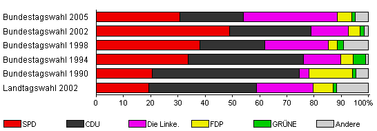 | Bundestagswahl 2005 | 68,1 | 30,8 | 23,2 | 34,4 | 5,4 | 1,4 | 4,7 | |
