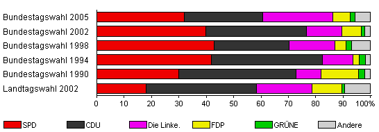 | Bundestagswahl 2005 | 63,2 | 31,9 | 28,6 | 25,8 | 6,2 | 1,9 | 5,5 | |