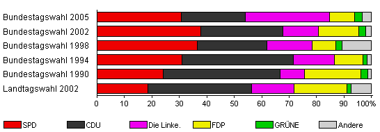 | Bundestagswahl 2005 | 73,4 | 30,8 | 23,1 | 30,8 | 9,2 | 2,8 | 3,3 | |