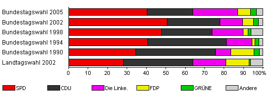 | Landtagswahl 2002 | 50,3 | 28,1 | 35,8 | 16,9 | 12,1 | 0,6 | 6,4 | |