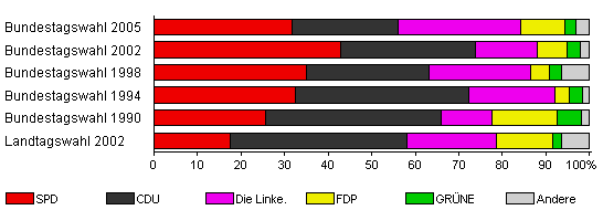 | Landtagswahl 2002 | 49,3 | 17,6 | 40,5 | 20,5 | 12,9 | 2,0 | 6,5 | |