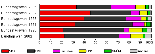 | Landtagswahl 2002 | 58,5 | 22,1 | 48,7 | 10,3 | 11,4 | 1,8 | 5,5 | |