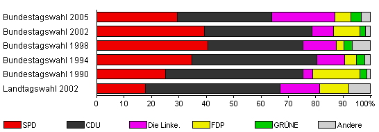 | Landtagswahl 2002 | 59,9 | 17,8 | 49,1 | 14,6 | 10,5 | - | 7,9 | |